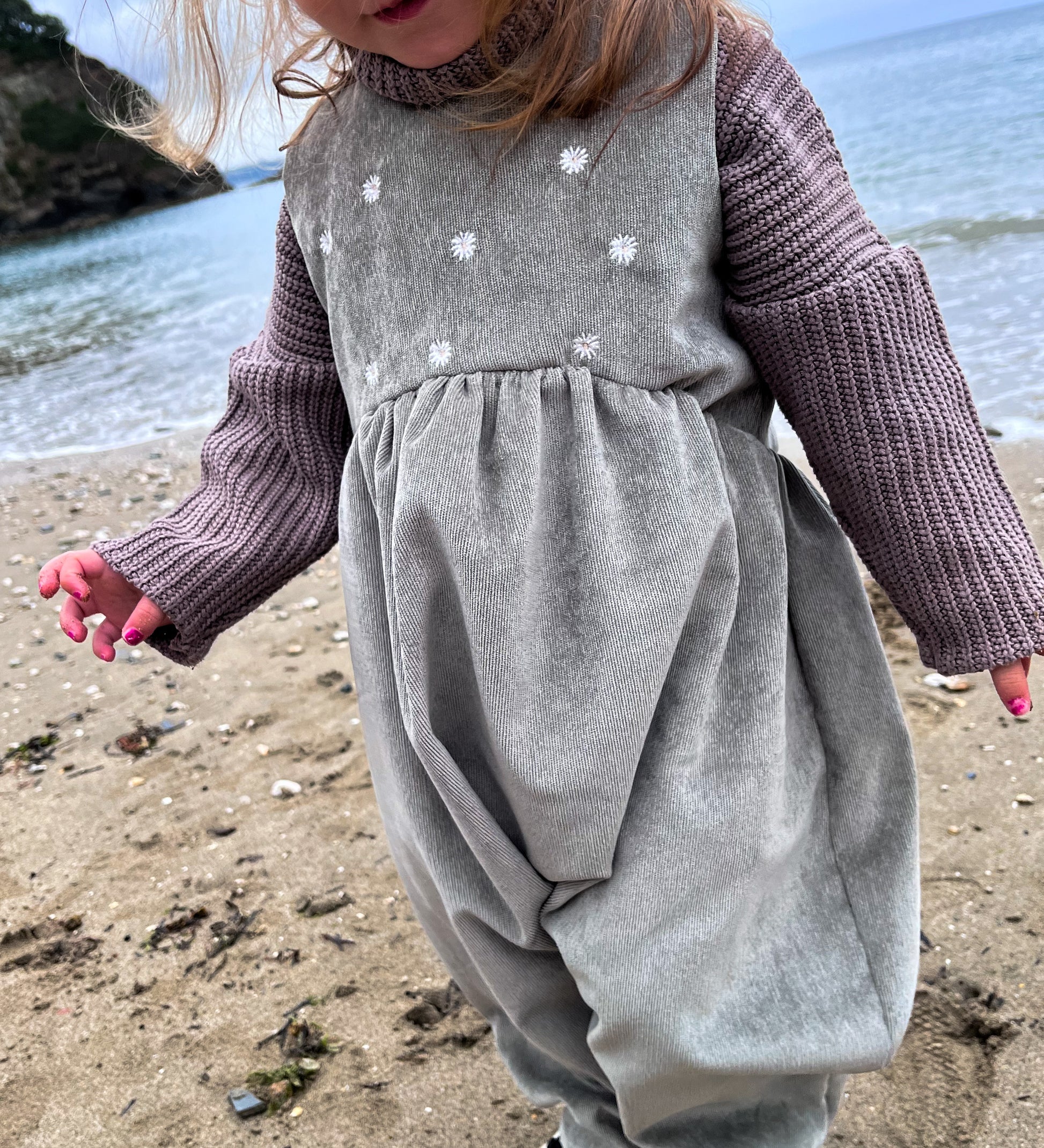 Sage Cord- Sage green needlecord with feature daisy embroidery on the bodice. Embroidery has been hand drawn and is stitched out in my studio by myself.